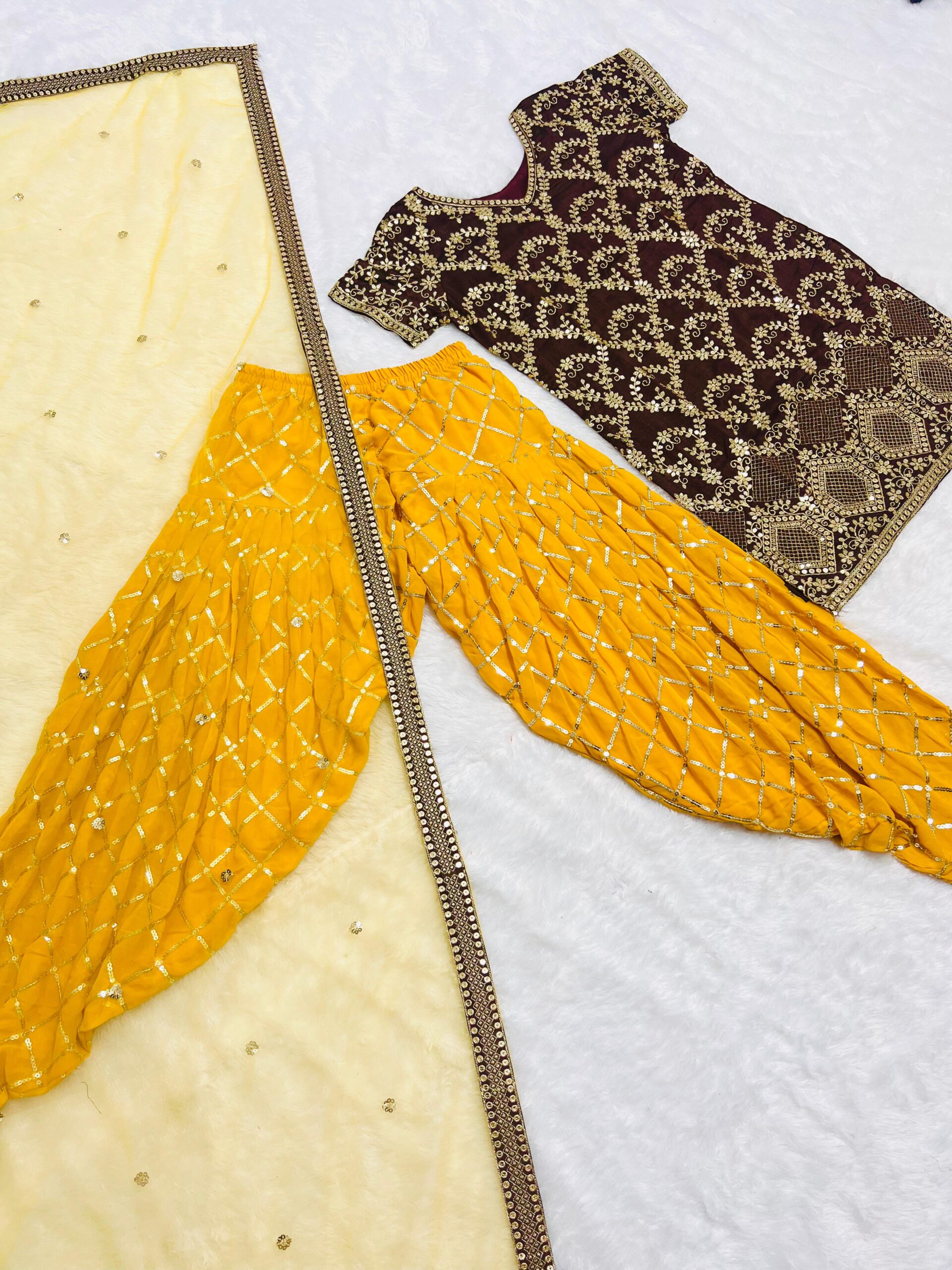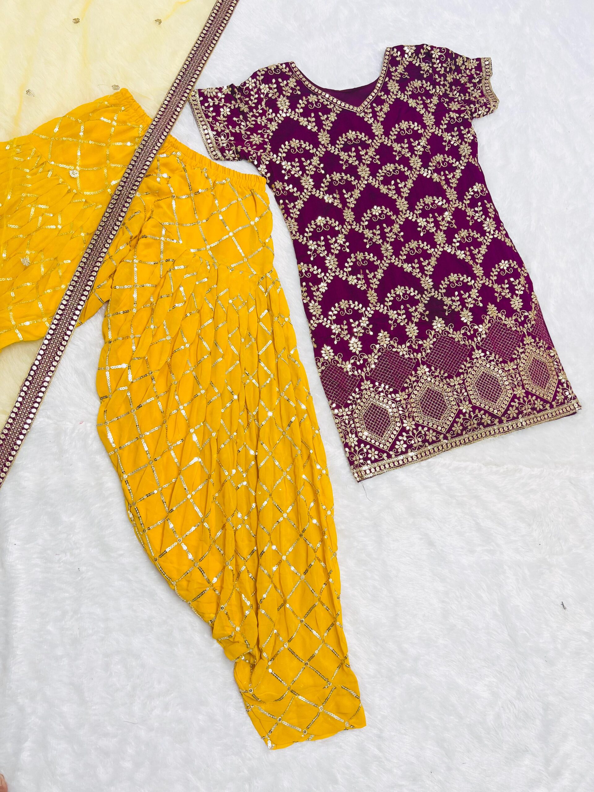 “Elegant georgette Punjabi suit with delicate sequin work, featuring a pink top & pant paired with a contrasting yellow dupatta. Available in sizes M to XXL.”