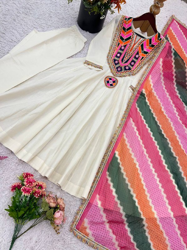 ✨ Step into elegance with this heavy crunchy silk set featuring rich embroidery, full flair, and a matching dupatta. 💃 Fully stitched & ready to wear in sizes M–XXL for a graceful ethnic look.