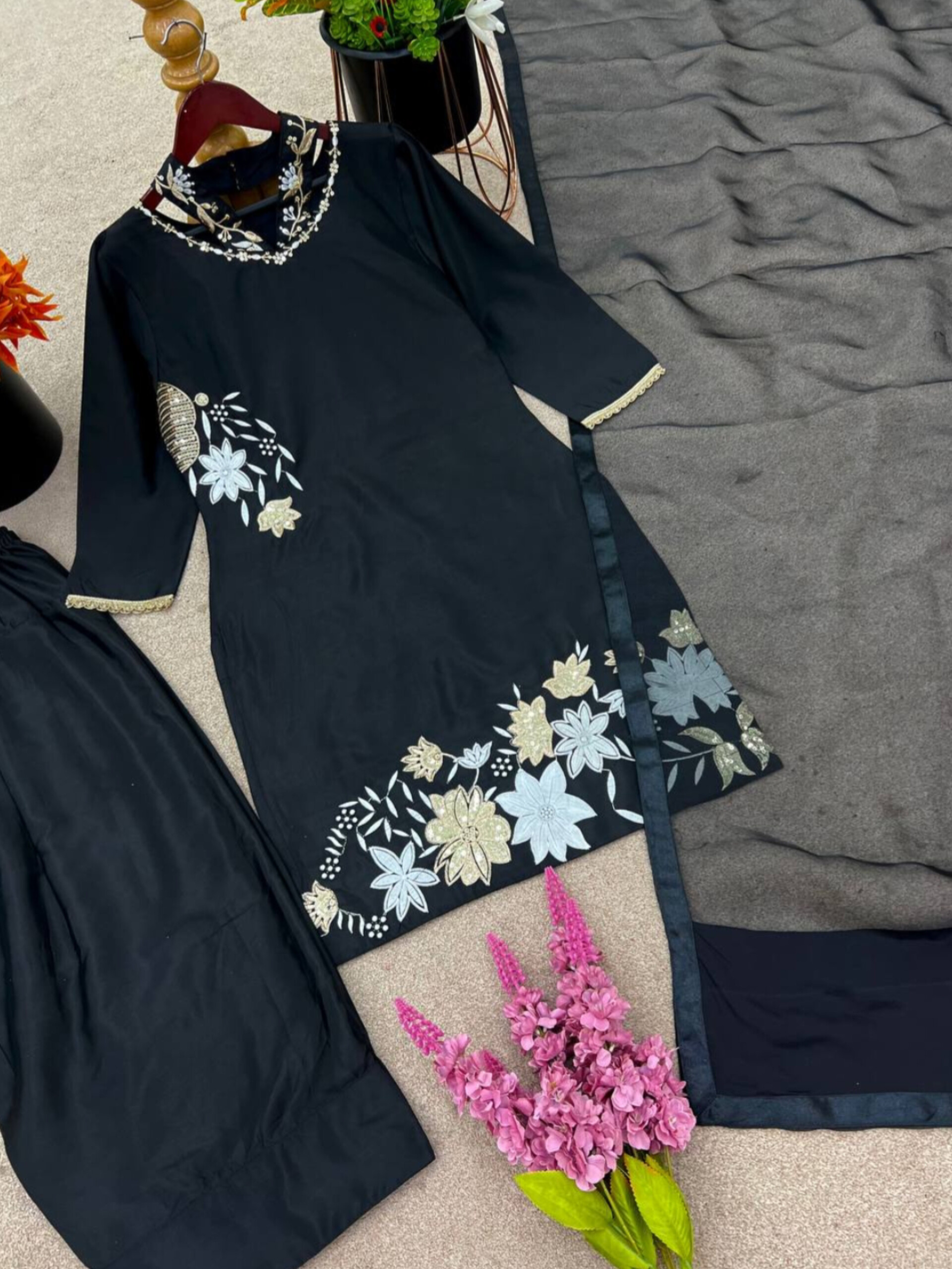 ✔ Natural Crepe Silk suit set with embroidery sequins work