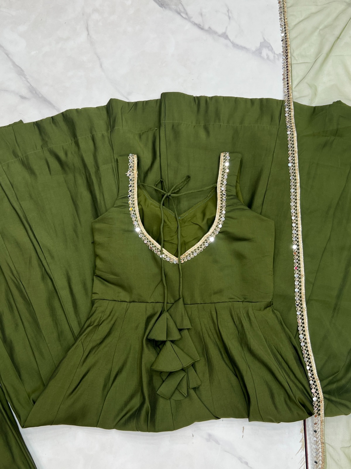 🧣 Dupatta: Soft nylon net dupatta embellished with fancy mirror lace border (2.20 m cut).