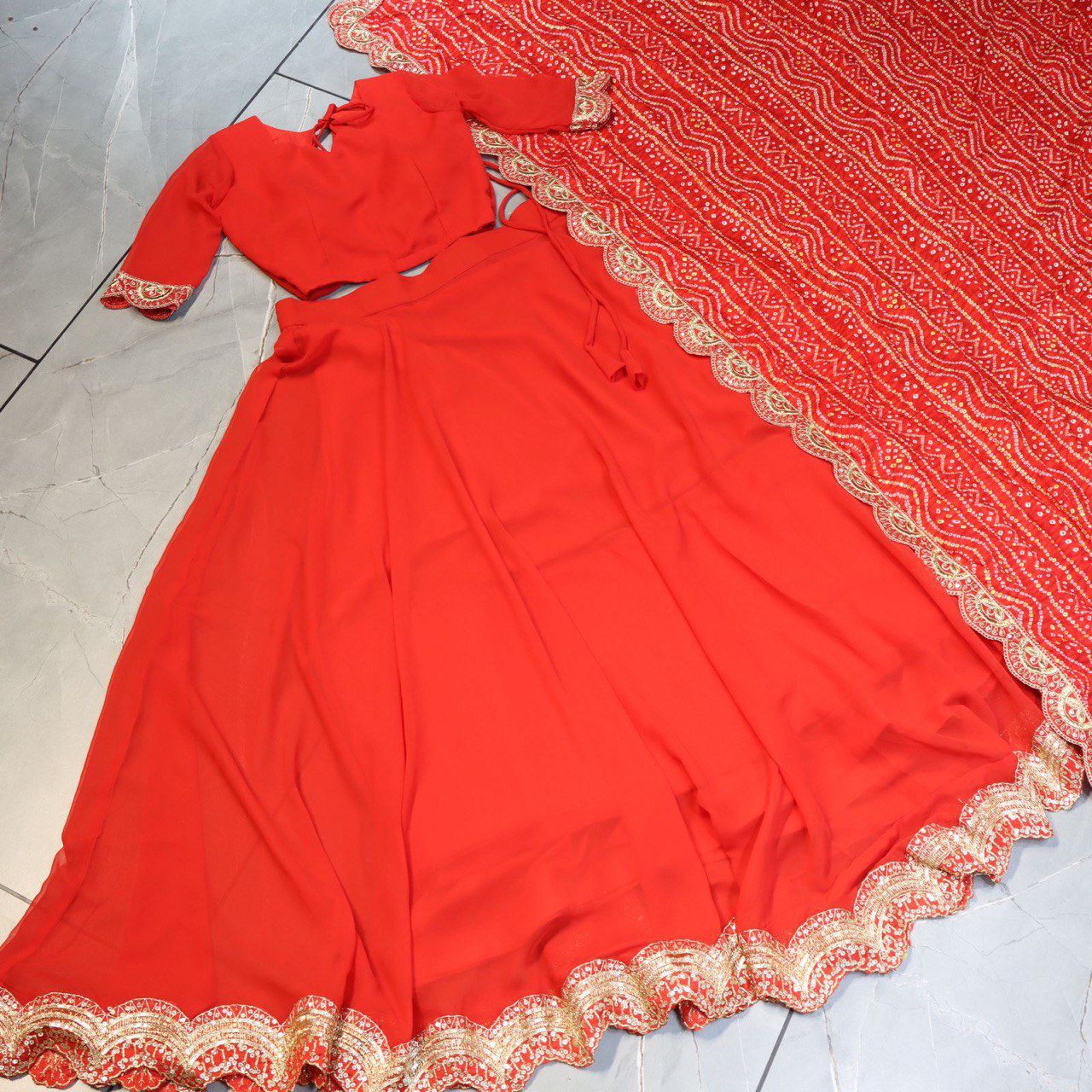 ✔ Exquisite red georgette lehenga with elegant embroidery border