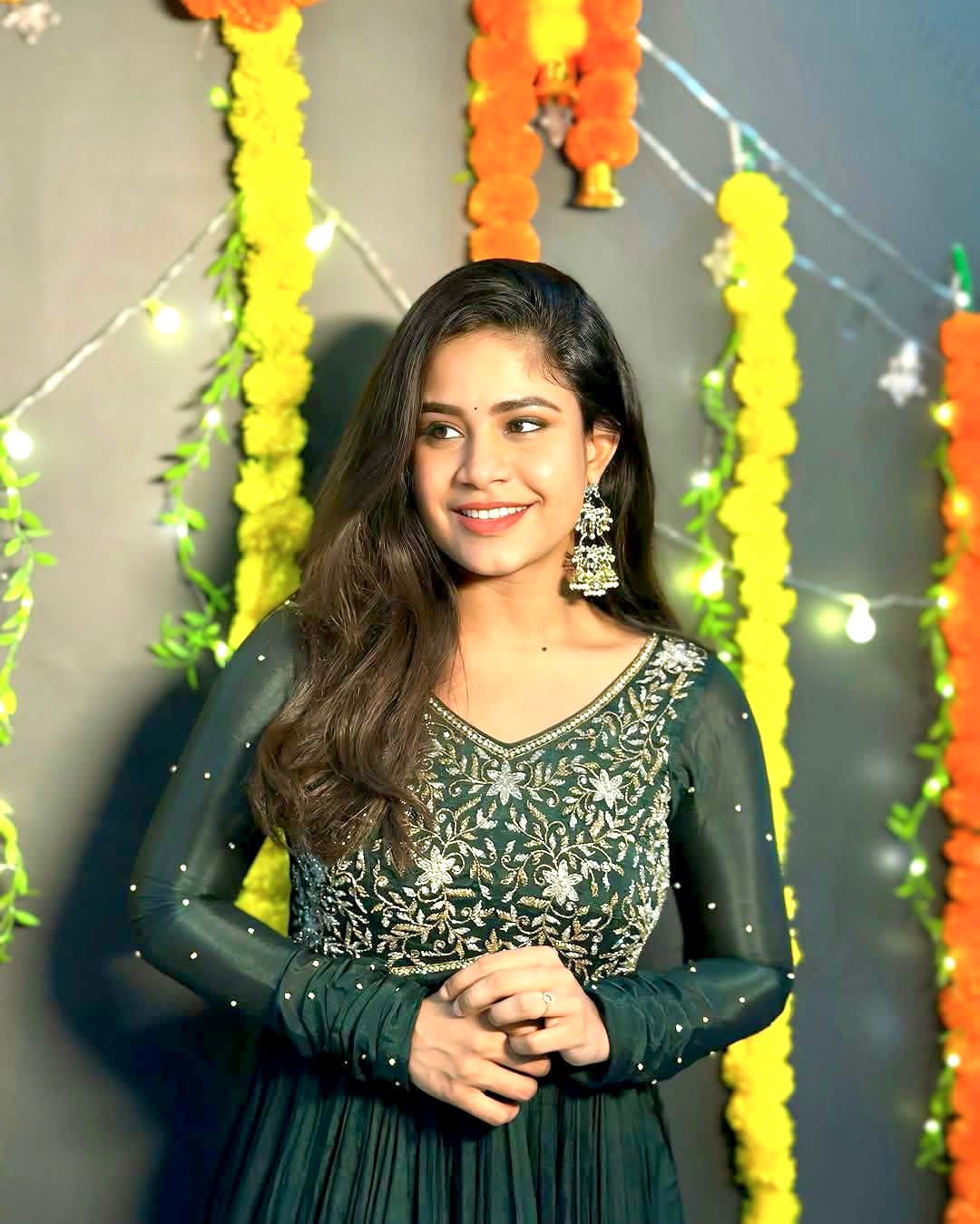 • Floor-length emerald green Anarkali gown featuring detailed silver embroidery on the bodice and sheer embellished sleeves. Made from lightweight, flowy fabric for all-day comfort, ideal for festive and wedding wear.