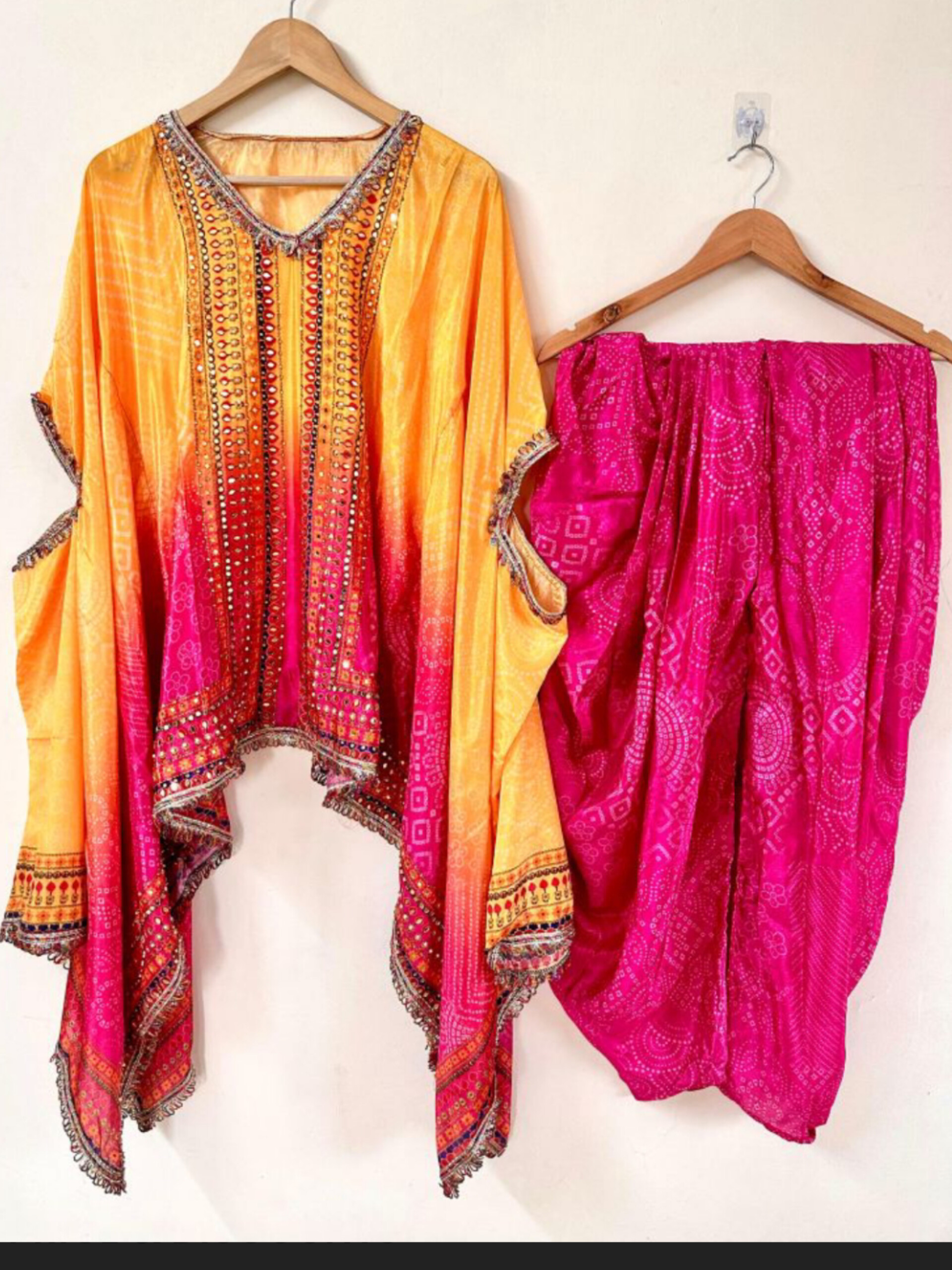 ✨ The Gorgeous presents a premium 3pc Kaftan with Dhoti & Bustier in Chinon Silk, detailed with original mirror, stone, moti & multi-sequence lace work. Fully stitched, sizes 38–46. Perfect for festive & party wear! 💃